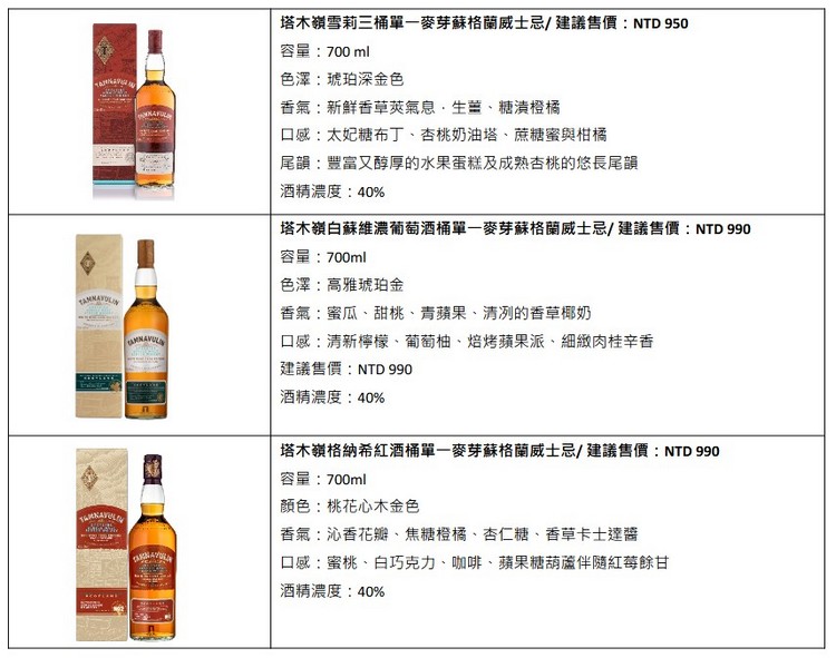 尚格酒業董事長奚大寧表示:「來自斯貝賽區的塔木嶺單一麥芽蘇格蘭威士忌,擅長透過不同橡木桶的巧妙運用,將甜美細緻的風味疊加豐富層次,不論是在國際賽事或國內的各指標性競賽接獲獎無數,被稱作項木桶玩家。因此能夠在上市短短五年,就成為台灣銷售量前十名、國人最喜愛的單一麥芽威士忌品牌,其實並不令人意外。」