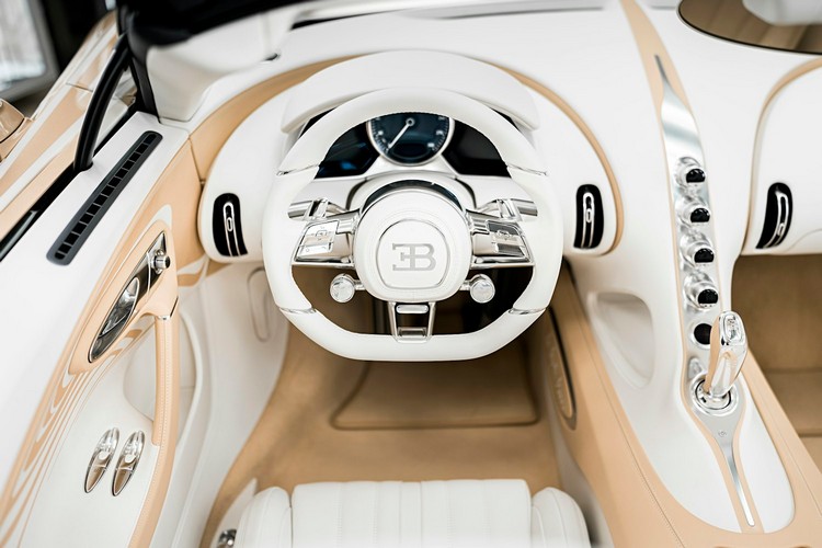 如此複雜的專案在最終車色定調前,經歷了 BUGATTI 色彩專家大量探索與實驗。最初從銀色概念出發,隨著創意討論演進,逐步轉向不同層次的白色調——一冷一暖,並加入明亮金屬粒子。經過無數次調整與反覆討論,這段耗時費工的過程最終催生兩種全新專屬客製色:上半部採用帶有金色光澤的溫潤色調,下半部則以細膩溫暖白色包覆車身。