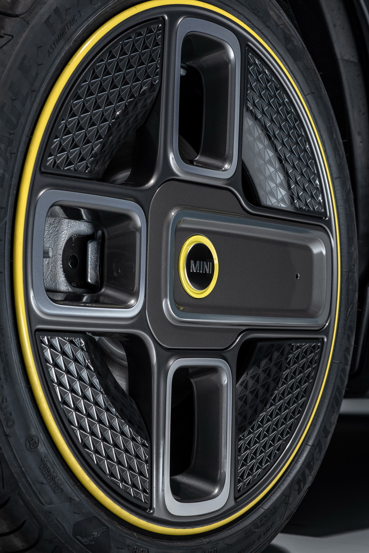 MINI Cooper S E外觀上在水箱罩、後視鏡與尾門等處都以代表電動車的黃色來加以凸顯。因為電動車不需要考慮引擎散熱的問題,所以是封閉設計。圓圓的燈殼內則是配備了LED頭燈。