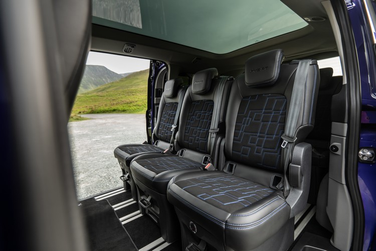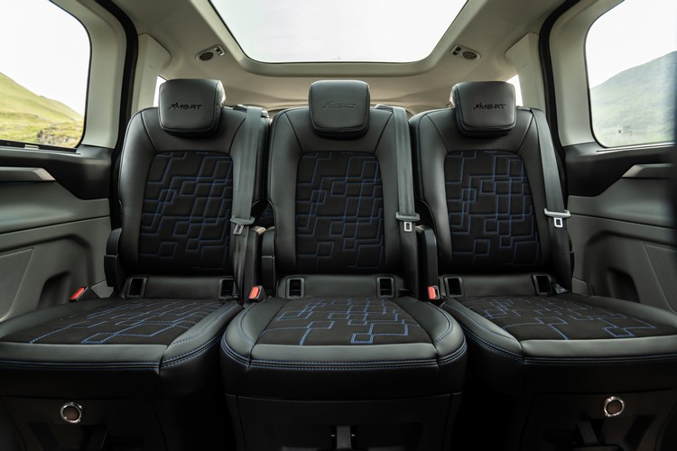 寬敞的內部空間具備 E-Tourneo Custom 的完整靈活性,第二排和第三排採用滑軌座椅,無論是載人、載行李、戶外探險裝備都能提供最大的調整彈性。座椅可向前後滑動也可以完全拆卸。符合人體工學的加熱前排座椅具有運動型側邊支撐,採用 Eco-Leather 和麂皮製成,並與六個後排座椅一樣採用藍色對比縫線。E-Tourneo Custom 和 PHEV 車型的前排座椅也配備LED發光的 MS-RT迎賓落地照明。高階車型還配備加熱運動型方向盤,帶有藍色 12 點鐘位置標記和縫線,並配備 13 吋中央觸控螢幕以及 FORD 的 SYNC 4 資訊娛樂系統。
