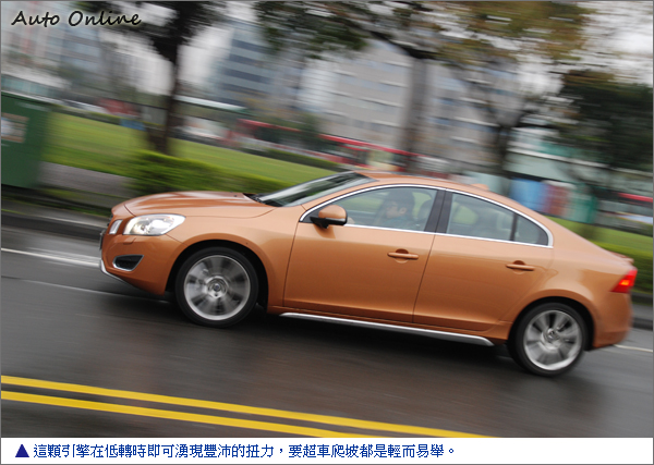 一周之後我發現這樣的顧慮是多疑了,藉由渦輪增壓與缸內直噴的協助,S60 T4無論是在高速公路或是山路都有相當不錯的動力表現。扭力的湧現出現在低轉速,因此不少時候出停車場斜坡油門踩深一點輪胎就開始叫了。