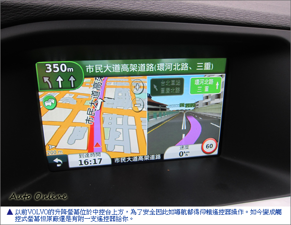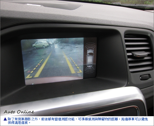 車上有定速沒啥了不起,但S60還會自動替你保持車距這就酷了吧!當前車放慢車輛也會跟著放慢,前方無障礙車輛就自動提升到你預設的速限。高速公路很多的意外都是駕駛注意力不集中,加上未保持行車距離一分神就追撞上去了。而連日大雨這套系統也都維持正常的運作,實在是很不錯的發明。