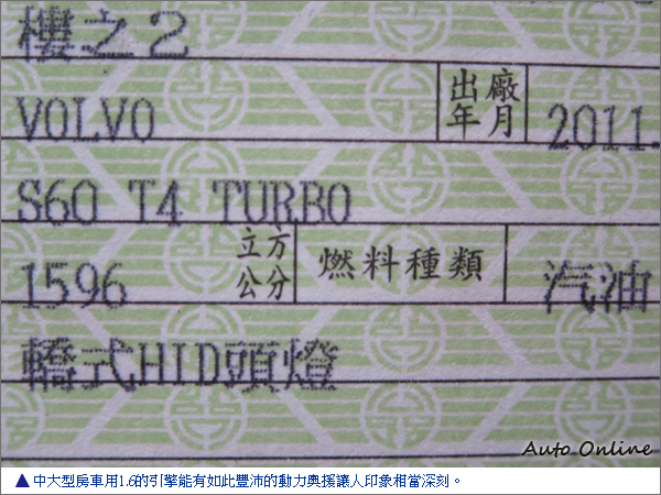 過去VOLVO採用同引擎搭載到不同車款的策略,因此對於T5或是T6我們比較熟悉。這裡所指的「小心」是因為這次S60所使用的是1.6升的引擎。雖然有其他業者也推出更小排量的渦輪增壓引擎用於掀背車上,但S60重1453kg,身形也屬於中大型房車,我們倒是挺好奇這顆引擎有沒有這般能耐能對應。
