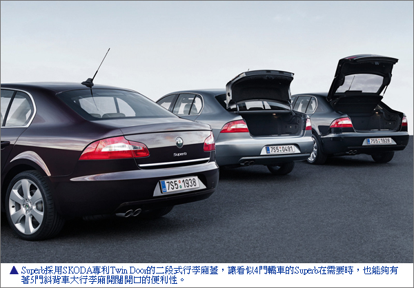 另外,Superb採用了SKODA專利Twin Door的二段式行李廂蓋,讓看似4門轎車的Superb在需要時,也能夠有著5門斜背車大行李廂開闊開口的便利性。可4門可5門的行李廂蓋設計,同時也是讓Superb車室靈活多變化的重要幫手之一