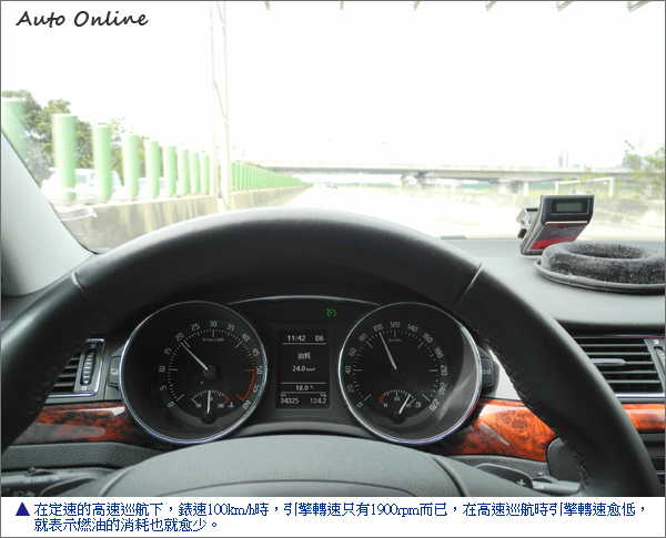 合宜的變速箱檔位齒比,加上這具2.0 TDI柴油引擎在1750轉的引擎轉速下即可達到35.7kg-m最大扭力的輸出特性。使之在定速的高速巡航下,錶速100km/h時,引擎轉速也不過1900rpm而已,在高速巡航時引擎轉速愈低,就表示燃油的消耗也就愈少。同時,在1750~2500rpm最大峰值的扭力轉速下,Superb 2.0 TDI可保有最強的加速力道,動力可說是隨傳隨到絲毫不遲疑。