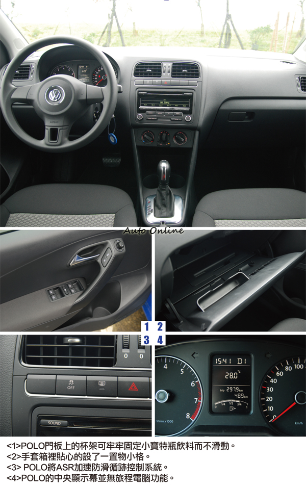 正如前文所言,VW在內裝上的一致性,因此不論熟不熟悉VW車系的人,在進入POLO後都會感到似曾相似的親切感。內裝黑灰配色已經是VW不成文的習慣了,POLO也是不例外,唯一有參雜其他顏色的地方,應該只有儀表、中控台以及車室各控制開關在晚上所暈透出來的顯示燈號罷了!