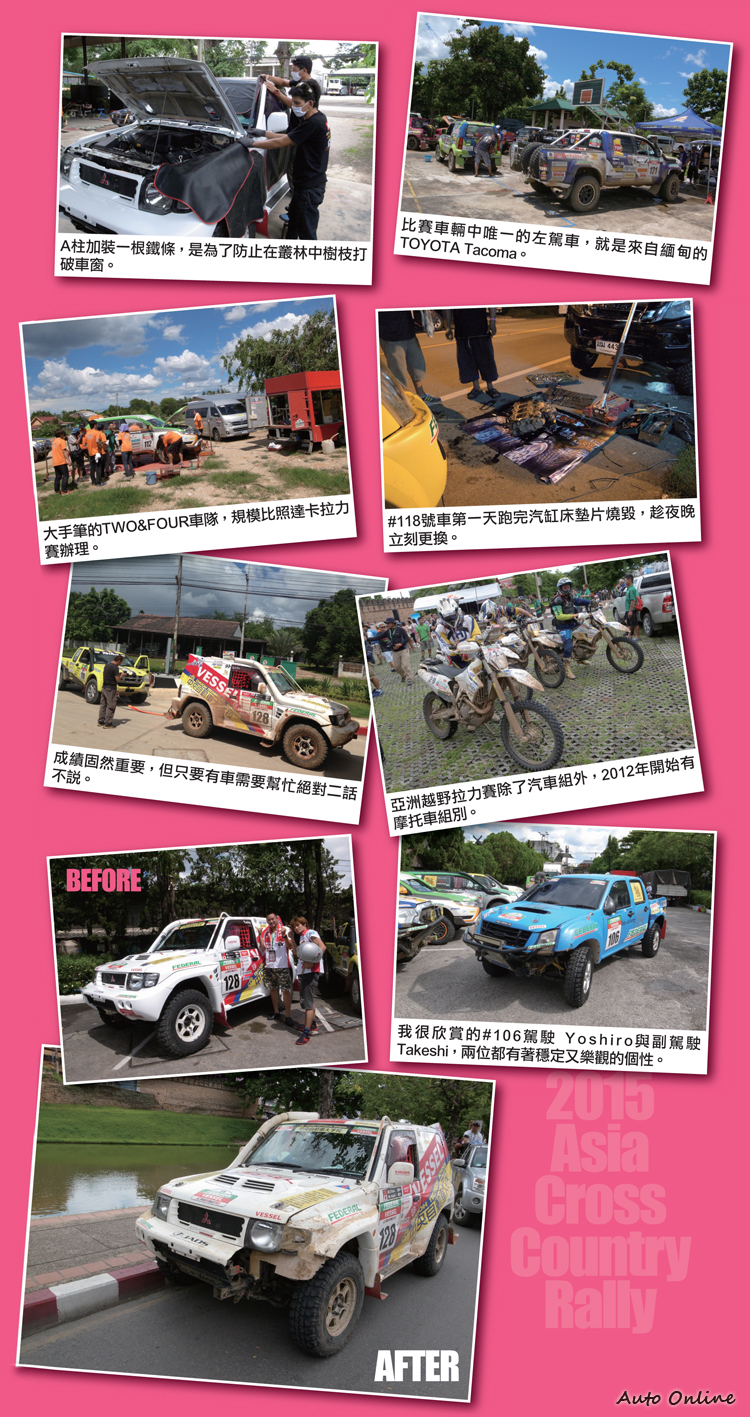 汽車線上編輯Dean Chou今年同樣與駕駛 Michihiro ASAI搭檔,礙於前兩年車輛狀況不佳陰霾,這一次ASAI把日本座駕Pajero Evolution運到泰國,並請來中央自動車大學的學生與老師作為後勤維修,使比賽可以無後顧之憂發揮實力。
