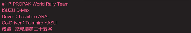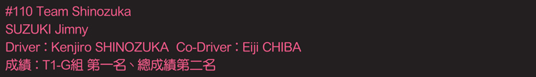 其最大亮點在於駕駛,駕駛Kenjiro SHINOZUKA 已66歲身體依舊健朗,他在1991年與1992年連續獲得WRC象牙海岸拉力冠軍,1997年甚至奪得達卡越野拉力賽汽車組冠軍,是第一個奪得達卡冠軍的亞洲人。首次參加亞洲越野拉力賽,憑藉的經驗與技術,確實在比賽中拿到優異成績。