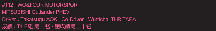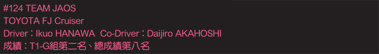 TWO&FOUR車隊已多次參加亞洲越野拉力賽,駕駛 Takatsugu AOKI 經驗、技術相當深厚。