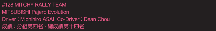 Pajero Evolution是一輛底子很好的越野車,搭載V6 3500cc的MIVEC引擎,最大馬力280ps與35.5kgm最大扭力,五速手排加上加力箱,足以應付各種路況、地形。有著2013年搭檔經驗,比賽的流程與默契比起前兩年大幅度進步,可惜在SS4的時候把左前避震器上座給撞裂,無法順利通過第四天下午的賽段,錯失站上頒獎台的機會,最後只以分組第四名完賽。