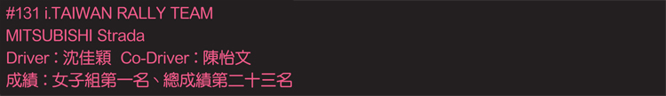 車手沈佳穎有多次參加亞洲越野拉力賽副駕駛經驗,今年是第一次從副駕駛升級正駕駛,完全不同的領域,比賽前顯得格外緊張。與他搭檔的副駕駛是陳和皇的女兒陳怡文,18歲就參與國際性賽事,不免讓人佩服她的膽識,首次作為副駕駛,心理的不安全顯於臉上,經過第一天、第二天的賽程後,越來越駕輕就熟,看來有遺傳的父親的賽車基因。