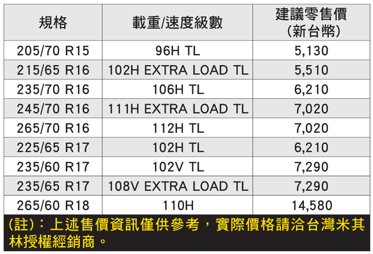 ![]() 大多數強調實用與便利性兼具的公路型SUV休旅車款,主要行駛的範圍和區域仍以都會和市區街道為主,而專為這些車款所研發的Primacy SUV,除了符合米其林休旅車胎產品一貫的安全性能,並同時提供舒適性能,無論晴天或雨天都能確保行車安全無虞,唯有如此才能充分滿足顧客對於「安全」、「穩定性」、「舒適性」和「持久耐磨」等四大面向的需求。 ![]() ▲選輪胎就想選球鞋,不同車種要搭配適合的輪胎才能發揮車輛性能與安全。