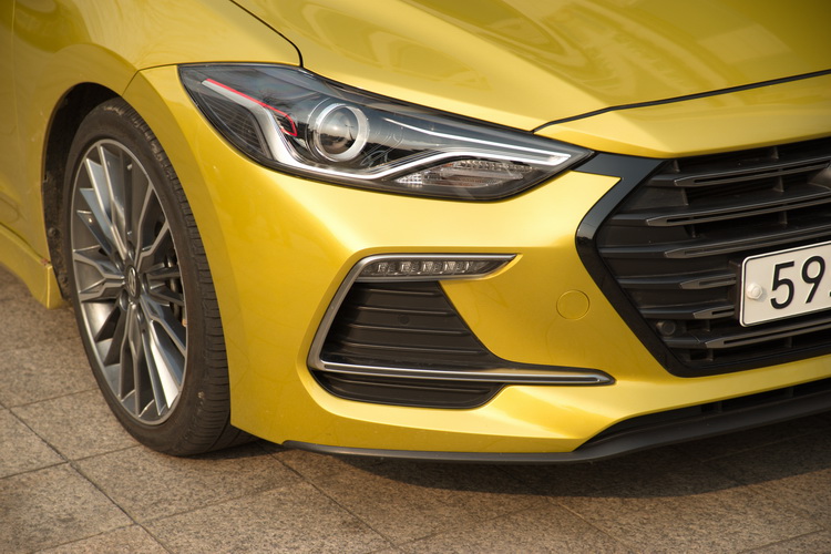 Elantra Sport(韓規車名Avante Sport)外觀上保有Elantra平順的輪廓線條,空力特性上也有很好表現,在行駛時能有優異的穩定性。車頭部分在頭燈、水箱罩與兩側進氣口處的造型都與Elantra有所不同,透過頭燈組內LED導光條及進氣口上LED日行燈與飾條的勾勒讓車頭面貌顯得更為動感。六角盾形水箱罩的橫柵則採暗色鏤空設計。