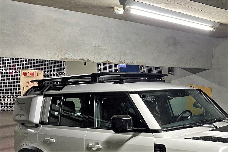 Defender選配EXPLORER PACK 探險家套件看起來相當帥氣,但有一點必須注意,那就是家裡停車場的高度。未加裝任何套件,正常車高為1,967mm,氣壓懸吊降低後則可為1,927mm,只要是兩公尺之內,大多數的停車場都沒有問題。如果選配遠征車頂架後,車高會增加約十公分左右,正常車高會來到約2,067mm,降懸吊後約為2,027mm左右,此時就必須選擇高度有2,100mm的停車場,而我們實際進入限高210公分停車場搬東西,那種幾乎零距離的壓迫感,讓人有點喘不過氣,有時甚至需要人下車緊盯車頂,才能安全無傷的進入,之後的準車主們,停車場限制高度限制真要謹慎確定。