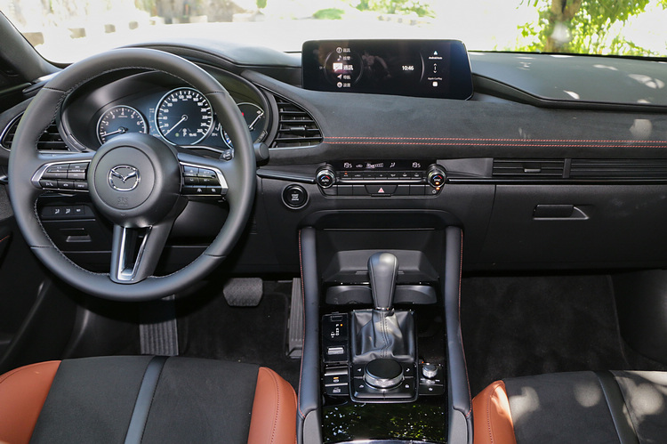 至於首度於 Mazda3 與 Mazda CX-30導入的「鋯石棕」車色,則為魂動之美增添亮點,令人回首再三。內裝方面,採用黑色 Leganu® 麂皮質感搭配「赤陶紅」雙色運動化座椅,其中熱情活潑的「赤陶紅」縫線更突顯畫龍點睛之妙;此外,座艙空間還以槍色環艙內飾作為混搭,若為Mazda3和Mazda CX-30車款,更將Leganu®麂皮運用於中控台或門飾板,以多層次設計堆疊凸顯日本匠人工藝於細節的考究。