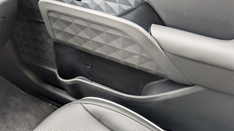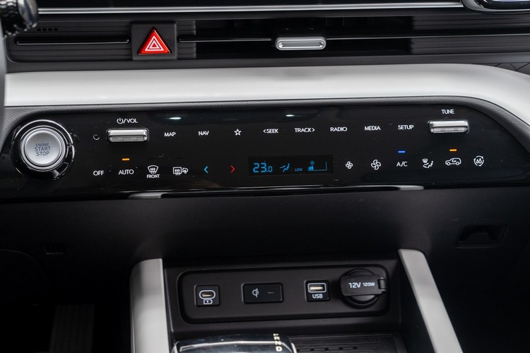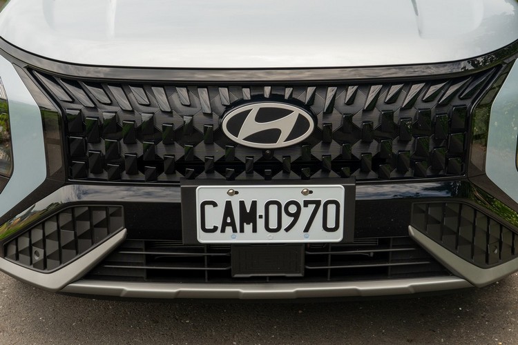 頭燈組從上至下分別為方向燈、雙透鏡LED近光燈、LED遠光燈(HBA自動遠近光調節),亮燈時創造出數位圖案般的樣貌就像一些更高階豪華的車款一般。車頭那超寬幅水箱罩外框有著HYUNDAI的「H」字形品牌意象,中間佈滿參數化鑽石造型的飾條來搭配中央的廠徽,與下方的參數化鑽石前氣壩/保險桿調性一致,一同襯托出車頭的大器感。