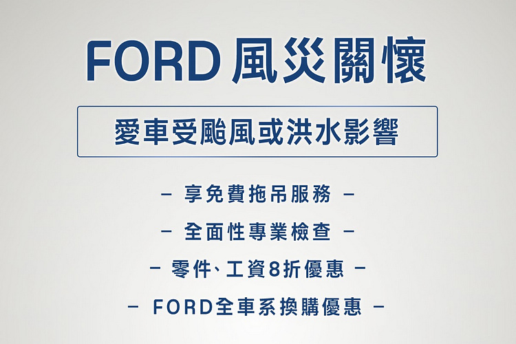 天然災害維修資訊請至Ford官方網站:福特六和 | 車主服務 | 用車知識 - 天然災害維修 (ford.com.tw)