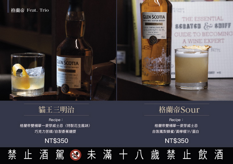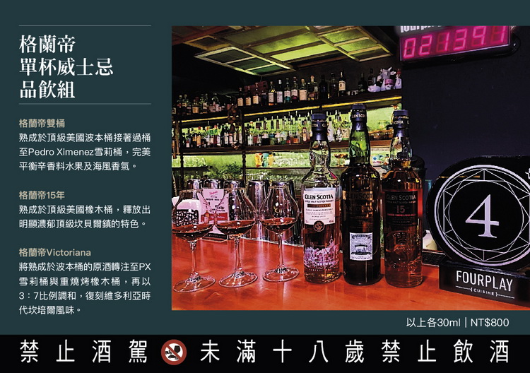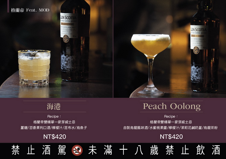 Recipe:格蘭帝雙桶單一麥芽威士忌/薑糖/百香果利口酒/檸檬汁/昆布水/烏魚子 NT$420 利用昆布的鮮甜提出格蘭帝威士忌中潛藏的海風氣息,加入薑糖與百香果帶出豐沛的果香,最後將烏魚子抹在杯緣上以恰到好處的鹹味與Umami反襯出酒體的甜美,充分表現出位於坎培爾鎮這個海港城市中的威士忌酒廠特色。 Peach Oolong Recipe:格蘭帝雙桶單一麥芽威士忌/自製烏龍風味酒/水蜜桃果醬/檸檬汁/茉莉花鹹奶蓋/烏龍茶粉 NT$420 以烏龍茶香與水蜜桃的甜味襯托格蘭帝雙桶威士忌分別來自於波本桶的香草風味,與由PX雪莉桶賦予的焦糖甜香與木質調,戴著微微鹹感的奶蓋伴隨著茉莉花香平衡了威士忌強壯的刺激感,只留下滿口餘香。 ◆MOD Public Bar INFO 地址:臺北市仁愛路4段345巷4弄40號 訂位專線:02-2731-4221 ◆MOD Sequel 僖閣 INFO 地址:臺北市台北市大安區樂利路11巷7號 訂位專線:02-2737-2955 FourPlay格蘭帝創調 Fusion Recipe:格蘭帝雙桶單一麥芽威士忌/鐵觀音萃取液/煙燻白可可/焦化柑橘 NT$350 來自坎培爾鎮的格蘭帝雙桶單一麥芽威士忌有著標誌性的煙燻感,以及焦糖硬核水果、太妃糖、桶陳的特殊風味。我們以經典調酒old fashion作為風味的載體,加入鐵觀音、煙燻可可脂、焦化柑橘。喝起來酒體柔順 ,沒有old fashion 給人的重擊,以可可襯托焦糖堅果的風味,鐵觀音給予延綿的回甘尾韻。 鐵觀音象徵Glen scotia 沈重似鐵的口感,卻不失典雅的尾韻,看似簡單溫順,卻有著Glen scotia 對威士忌不凡的堅持。以簡單的架構造就複雜的風味堆疊,在有限中尋找無限的可能;以昨日的經典搭配上今日的創意,成為明日的流行——Fusion 。