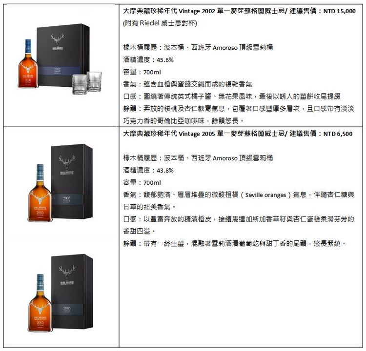 《大摩典藏珍稀年份系列 Vintage 2002》被理查.派特森描述為「傾瀉多重感官的萬花筒」,裝盛於台灣獨家手工打造,附有Riedel威士忌對杯的精緻黑木盒中,以尊貴藍襯出非凡年代2002的標記,送禮更顯不凡格局。《大摩典藏珍稀年份系列 Vintage 2005》令人聯想到「在赫雷斯中心盛開的新鮮橙樹」,並裝盛於台灣獨家的精緻黑色木盒,典雅綠襯出非凡年代2005的標記,送禮傳達您的真心誠意。
