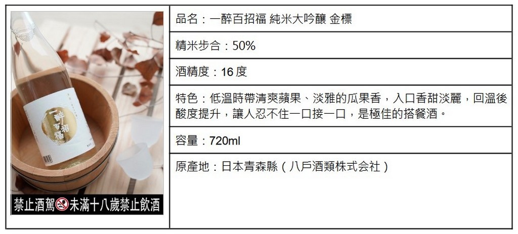 ![]() 喝酒是許多人放鬆心情及壓力的一種方式。綠芽酒藏也深信在每個重要時刻,日本酒也可以化身為快樂及歡慶的啟動器,與每位在場的賓客一起創造出歡樂滿溢的回憶。因此特別與「八戶酒類株式會社」共同推出了一款名為「一醉百招福」的銘柄,旨在將喜悅和幸福感融入每一滴酒中,帶給人們更多笑容和快樂。