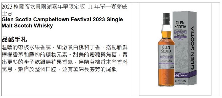 而活動的最大焦點–極為珍稀限量的「2023格蘭帝坎貝爾鎮嘉年華限定版 11年單一麥芽威士忌」,是格蘭帝調酒團隊將預先熟成於美國橡木桶10年以上的優質原酒,轉注至特選白色波特桶中過桶熟成12個月;這款11年的輕度泥煤酒款富含明亮水果風味,與典型坎貝爾鎮柔軟煙燻和海鹽交織在一起,成就圓融完美的風味,不經冷凝過濾,以原桶強度裝瓶,表現出100%原汁原味的坎貝爾鎮風情。