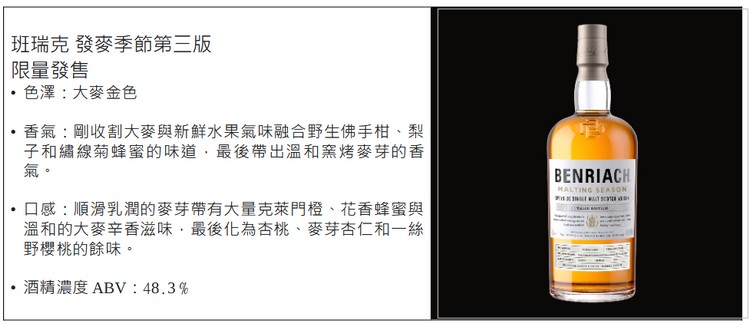 「地板發麥季節第三版」威士忌,濃度為48.3%,帶著麥芽甜香,以及野生佛手柑、梨子和繡線菊蜂蜜的香味。口中先迎來充沛的克萊門橙、花香蜂蜜與溫和的大麥辛香滋味,隨後再化為杏桃、麥芽杏仁及一絲野櫻桃的餘味。