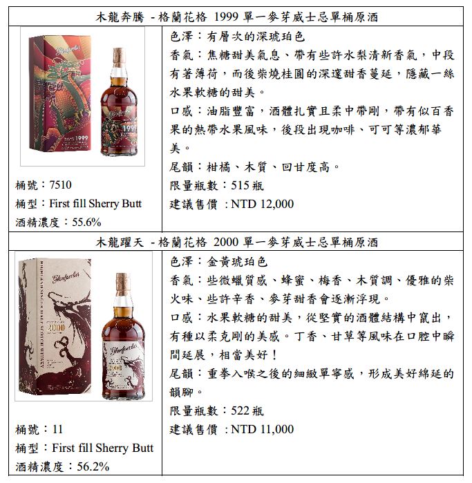 而為迎接即將到來的龍年,昇恆昌與格蘭花格也特別取其意象,打造二款高年份單桶原酒「格蘭花格木龍典藏特別紀念版」。昇恆昌結合「生肖」作為主題,從龍年開始,打造系列作品,十分具收藏意義。 其中1999年入桶的「木龍典藏特別紀念版-木龍奔騰」包裝以華麗的大紅色為底,色彩斑斕的龍登旭日,象徵朝氣活力與無比的好運,而蕩漾在天際之間如雲彩般的線條,則是流經格蘭花格酒廠的斯貝河(Spey River )。初聞焦糖般甜美的氣息,帶有些許水梨的清新及薄荷清涼,接著柴燒桂圓的甜香蔓延,從熱帶百香果香到咖啡、可可的濃郁,口感變化豐富。 另一款2000年入桶的「木龍典藏特別紀念版-木龍躍天」則是以低調的米白與赭紅色潑墨剪影呈現祥龍在天,鎏金的祝福化為星點落在龍身,為新的一年妝點幸運與財氣。蜂蜜與梅子的香氣,水果軟糖的甜美,從堅實的酒體結構中竄出,有種以柔克剛的美感,丁香、甘草等辛香風味,在口腔中瞬間延展。 在頂級雪莉桶裡浸潤超過20年的單一麥芽威士忌,酒體豐盈飽滿,尾韻滑順悠長,二款木龍典藏特別版,無論做為春節贈禮或精心收藏都極具吉祥祝賀的意義。