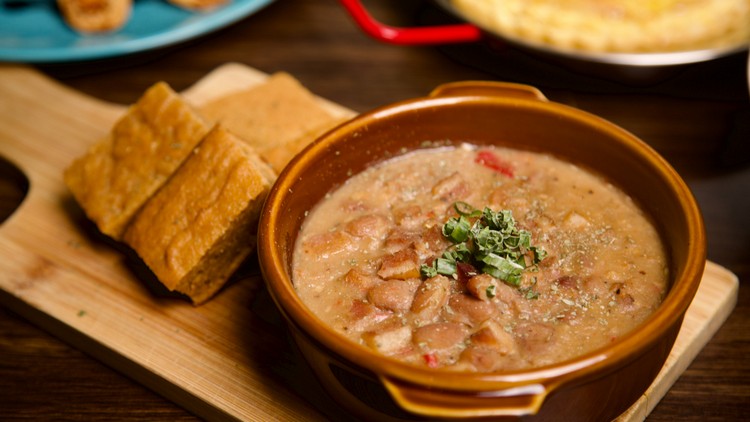 斑豆火腿湯佐玉米麵包是蒙大拿經典家常菜,融合早期歐洲移民及北美飲食文化。滿滿的斑豆加入用洋蔥炒香的煙燻火腿,再用辣椒提味,撒上蔥花點綴。佐以ABV自製玉米麵包,飽腹感十足。
