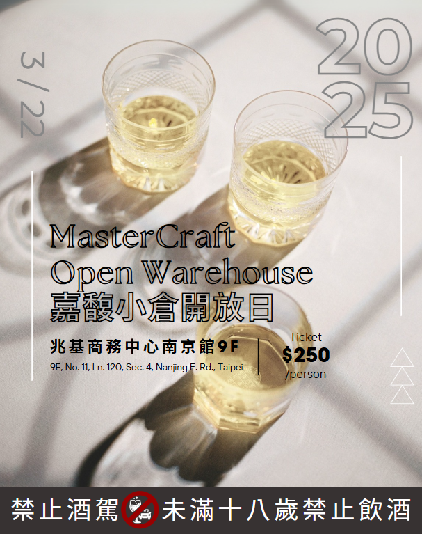 不具名主管表示:「嘉馥代理酒類之初,由於團隊獨到的品味與喜好,被業界買家戲稱味蕾領先市場5-7年,酒品都需要先買起來等市場成長後才能理解。經過了十年的等待,這次將倉庫的珍藏一次開箱,邀請酒友來看看當時的酒是否符合現今的口味? 不過,我們仍然會持續往前,現在的新品可能有些太超前又得收入珍藏了吧(笑」「嘉馥小倉開放日」MasterCraft Open Warehouse Day詳細活動資訊請洽活動專頁:https://www.accupass.com/event/2503040816501972568356