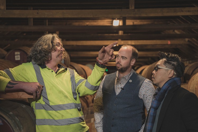 ▲(左起)班瑞克酒廠橡木桶管理員Calum Purcell向班瑞克亞洲品牌大使Stuart、李奧社長