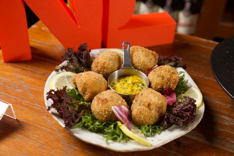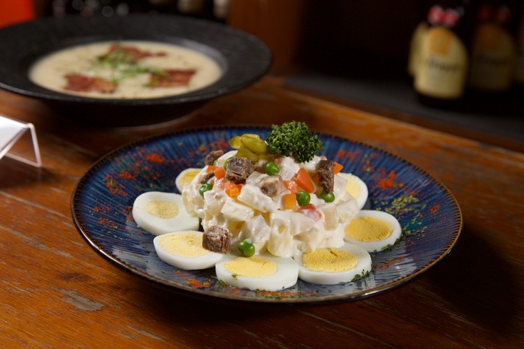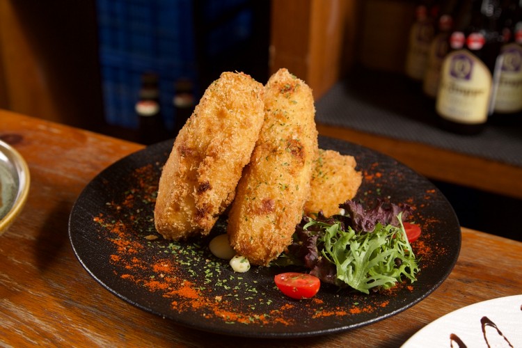 緊接著的「荷蘭式涼拌馬鈴薯」則是另一種風景。綿密的馬鈴薯拌入酸黃瓜、青豆仁、紅蘿蔔、雞蛋與荷式美乃滋,微酸爽口、層次分明,是歐陸家庭餐桌上永不退流行的存在。而「荷蘭風味起司可樂餅」的酥香則為整場饗宴添上一抹街頭氣息——金黃外衣下包裹著濃厚的莫札瑞拉起司與薯泥,一咬即化、鹹香四溢,彷彿置身阿姆斯特丹運河邊的啤酒小館。