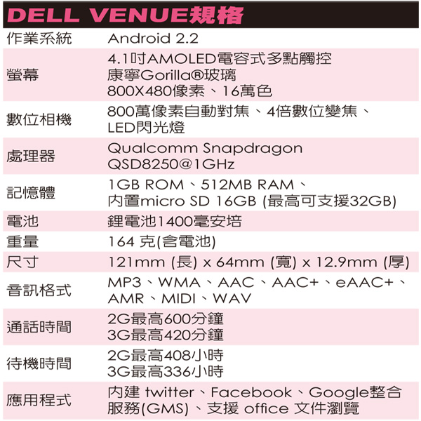 在今年4月矚目已久的DELL VENUE正式在台灣發表,DELL從別的領域跨足手機市場,就帶走功能強大DELL VENUE席捲台灣手機市場,手機造型酷炫外還標榜DELL獨家研發設計的Stage介面,提供高度個人化介面操作模式滿足時尚都會人的需求。