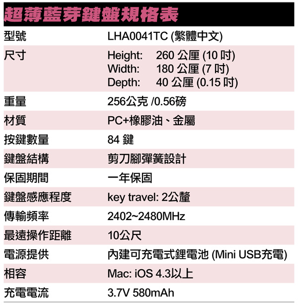 ![]() 平板電腦與筆電的最顯著的差異便在於鍵盤的有無,對於許多iPad的玩家來說,透過觸控螢幕寫寫簡訊還不成問題,若要把iPad當成筆記本或是有大量文字輸入需求的人來說觸控輸入鍵就不是太方便了。有鑒於此曜越科技便推出了支援全系列蘋果商品的LUXA2超薄藍芽鍵盤。