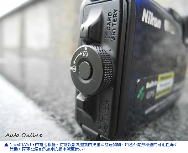 在最容易滲水的記憶卡、電池的機蓋上,Nikon特別設計了堅實的按壓式旋鈕開關,將意外開啟機蓋的可能性降至最低,同時也讓自然滲水的機率減至最小。AW100的防水標準則可到達JIS/IEC保護等級8(IPX8),讓其能夠在10公尺深度的水下拍照達60分鐘之久。