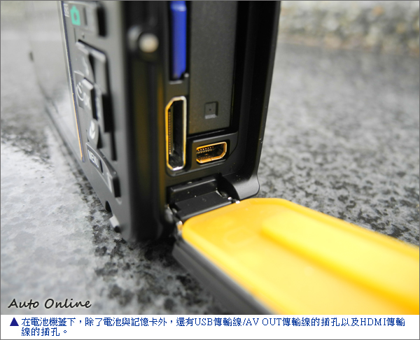 AW100在電池機蓋內,設有一HDMI的影音輸出插座,透過HDMI傳輸線,可將相機記憶卡內的相片或是影片,直接輸出至也具有HDMI插座的螢幕上播放,與多數人一起欣賞、回味這些影音記錄。