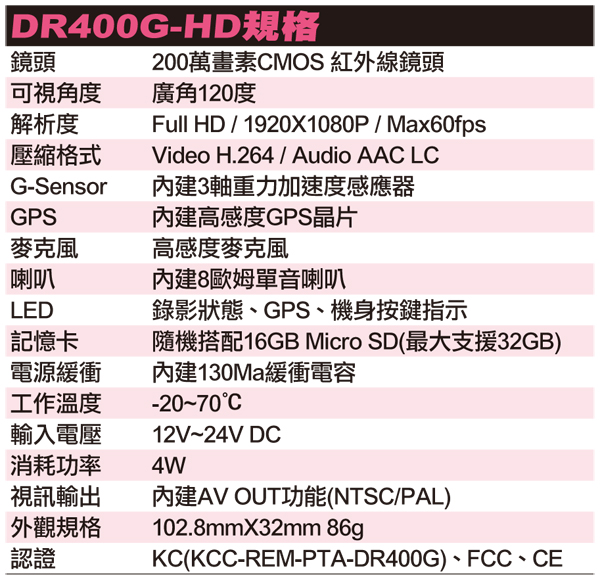 DR400G-HD是專為行車使用所設計的行車記錄器,與坊間許多由小型錄影裝置轉移用途的行車記錄器有很大的不同: 第一、專為行車所設計的行車記錄器不會有電池的設計,以確保行車記錄器在車內使用的安全。 第二、專為行車所設計的行車記錄器不會設有螢幕,將駕駛者視線有可能受到的干擾降至最低。 第三、真正的行車記錄器應該具備G值感應器,以利判斷事故發生時的責任歸屬。 惟有完全具備上述三項條件,才能稱為行車記錄器。