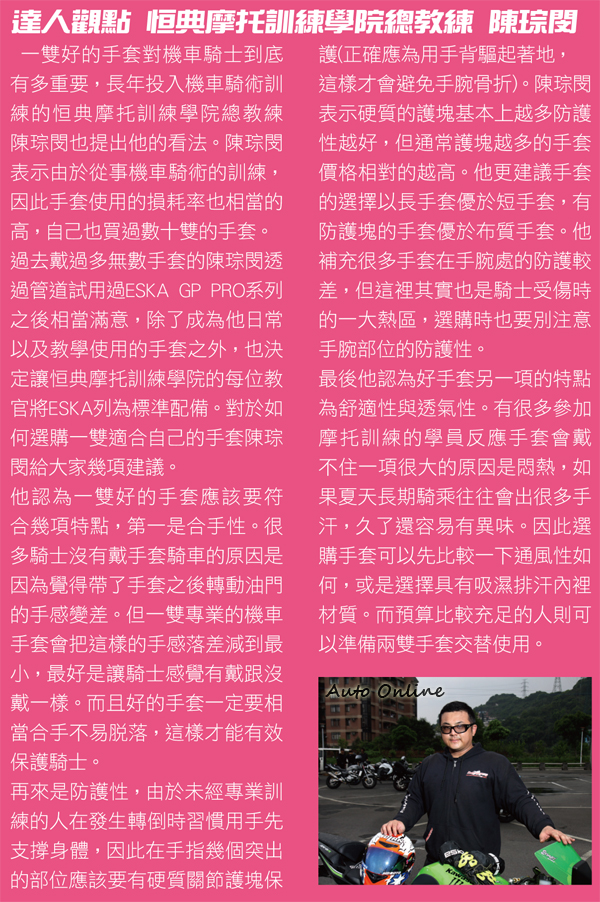 Max大機機時間![]() ▲百年以來ESKA就只專精手套的製造,在對皮革布料的熟稔之下,ESKA唯一推出的非手套商品便是頭套與口罩。經過兩個月的試戴之後ESKA良好舒適的穿戴性令人印象深刻,但由於這樣的測試報導中我們並不會要測試其防護性故意去摔車或犁田,但從眾多的防摔塊來看ESKA系列的手套防護性應該是不差。
