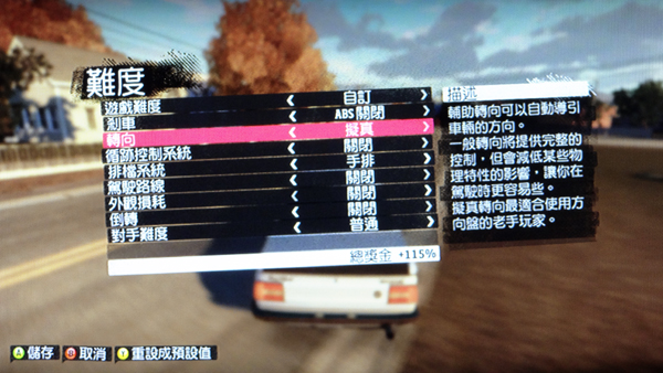 玩賽車Game最頭痛的地方是找到合適的方向盤或搖桿,這次是以無線手把來進行,少了方向盤的紮實感,幸好原廠搖桿的油門與煞車控制都可微調,手指輕重真的有差,可惜的是只能從預設的控制組選擇,而不能自己指定個別的控制鍵位置,因此最後為了能夠線性加速,只能以非常不就手的拇指來換檔,強烈建議想要玩得盡興的玩家還是去弄一套方向盤。截稿前只有短短三、五天時間,能在下班閒暇之餘練練車,不過很快就順利攻入倒數第二關,感覺上連筆者這種嫩咖都很容易上手。大致來講,一般熟悉賽車遊戲的玩家,花個半天時間熟悉控制鍵之後,把輔助功能全關也可以不至於老是撞牆,不過想要彎道超車,還是得非常小心煞車力道與時機才有可能,否則很容易鎖死當自耕農。