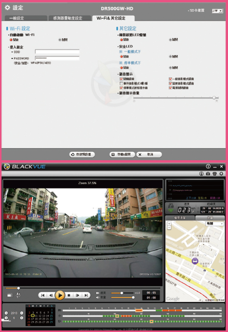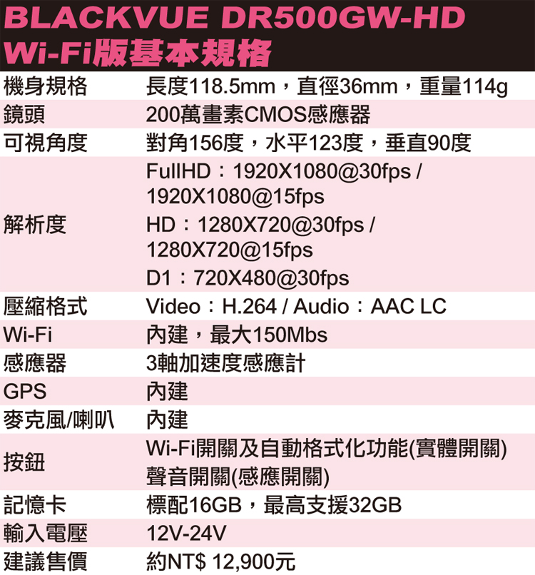 WI-FI口紅姬新登場![]() BLACKVUE近期推出型號 DR500GW-HD的全新機種,除了將鏡頭視角提升到156度外,最重要的就是導入了Wi-Fi的科技,透過機身的WI-FI訊號與智慧型手機進行連線,消費者除了可直接觀看過去的紀錄畫面,亦可在錄影時同步撥放,大幅提升使用的方便性。