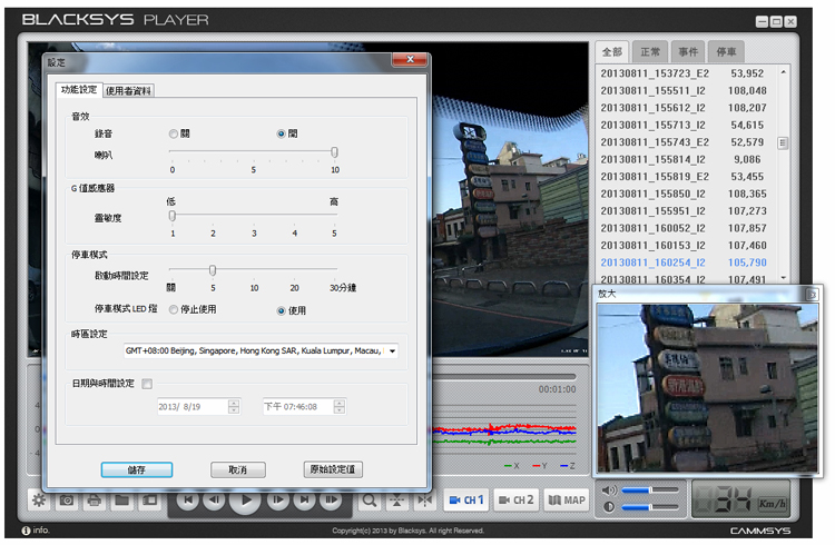 ▲內建軟體可以同時顯示雙畫面,右下角也有地圖資訊與車速,並有G值感應圖表。