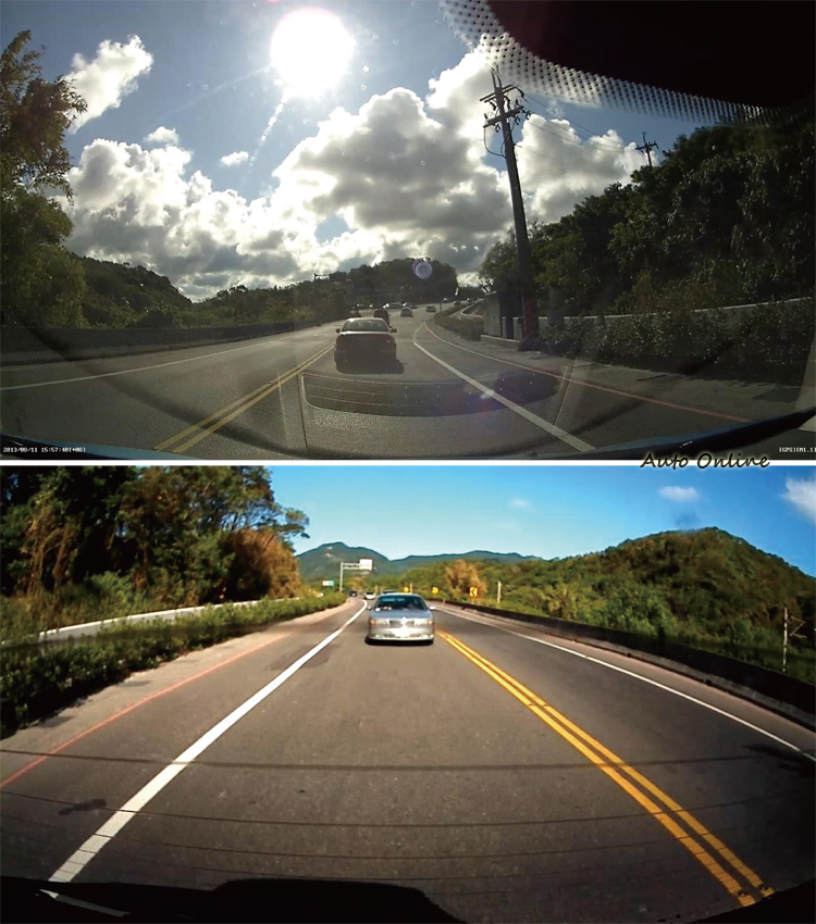 看起來,這組鏡頭的周圍變形明顯,不過車牌號碼卻還能辨識出來。就畫質而言,前鏡頭在白天的效果算在水準以上,通過隧道的光影變化影響不大,但逆光下時偶爾畫面過暗,顯示它的CMOS動態範圍還是不夠理想,或許大家可以期待業者再引進不怕逆光的CW-100。