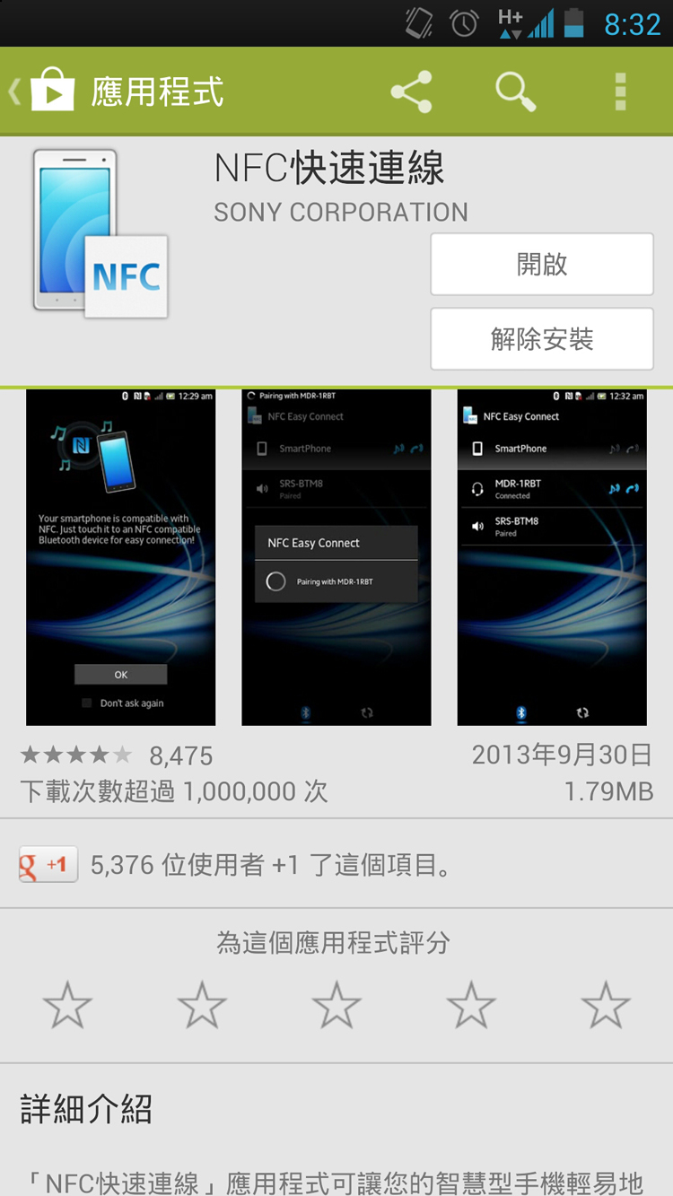 實測體驗![]() ▲手機連上SRS-X5後,即可透過內建的麥克風進行通話。先說個題外話,其實筆者並不大喜歡藍芽喇叭,因為這類型的產品由於體積較小,所能容納的單體都會受到限制,導致在音質的表現上都不會太好。即使它們的外型都很吸引人,但是對於重視實用性質的我來說,用兩三千塊的價位買一顆功率小的藍芽喇叭真的不是很划算。因此,剛開始看到這項產品時對於它的期望度並不是太高,雖然它的大小比印象中的藍芽喇叭大上一些,但是總對這類型的商品有著刻板的印象。 ![]() ▲開啟手機的NFC功能後,只需要靠近藍芽喇叭上的NFC圖示即可進行快速連結。![]() ▲透過Android的Play商店下載NFC快速連線APP後,即使不是SONY自家的手機,也能輕鬆連結藍芽喇叭。
