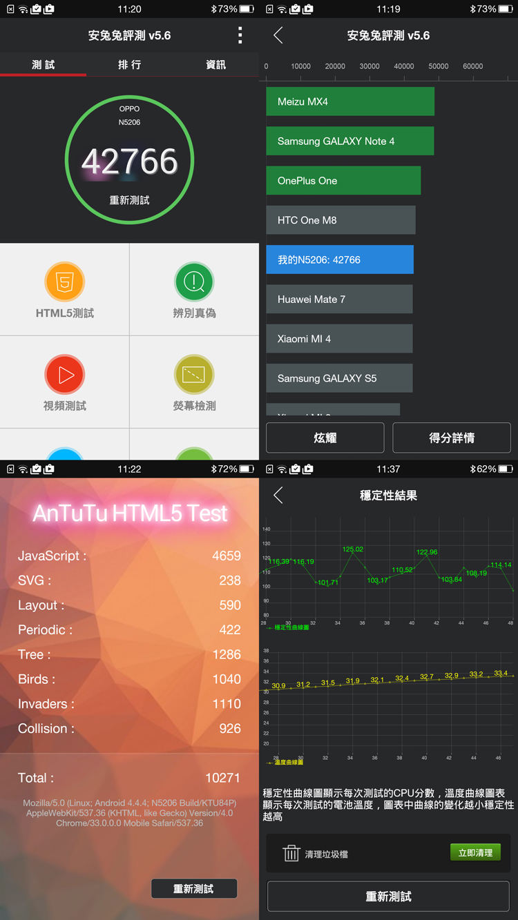 效能實測老實說,筆者拿到N3時著實被它的質感給吸引到,不過畢竟是手機的評測,該要跑的測試還是不能少。為了節省版面,筆者選擇大家熟悉的安兔兔評測來執行跑分,首先是效能測試成績的部分,N3獲得42766的成績結果僅次於HTC M8,表現還算不錯,而在HTML5的測試則是獲得10271分,至於穩定性的測試成果上則是有待加強。 ![]() ▲使用安兔兔跑分,N3獲得42766的成績,結果僅次於HTC M8。其他測試的分數也都還算不錯。