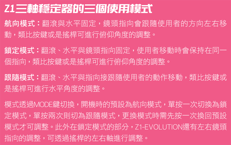 GoPro專屬Z1-EVOLUTION![]() ▲Z1-EVOLUTION搭載第三代的控制器,不只穩定還能有更細膩的調整。Z1-EVOLUTION是Z1-PROUND的後繼版本,這款穩定器是針對GoPro所開發出來的商品,隨著技術的精進,不僅三個軸的可轉角度提升至333度,它所搭載的無刷馬達與第三代控制器的搭配也更為完整,這能使它擁有比前一代更為細膩的操控表現。 ![]() ▲Z1-EVOLUTION採用的是遙桿的設計,點擊可切換MODE與長按是穩定器的啟閉。![]() ▲3.5mm影音傳輸孔,可將GoPro的影像傳輸至外接螢幕。
