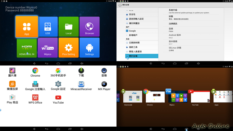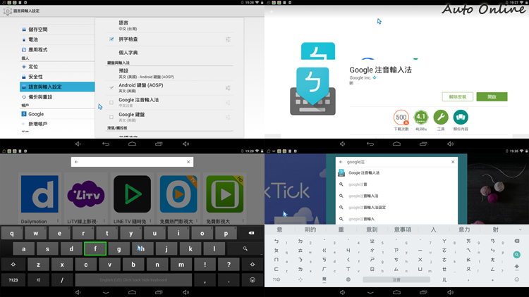 ![]() ▲JUNETO P96微投影機亮度最大100流明,最大投影可達150吋。投影機最重要的就是影像技術,JUNETO P96微投影機使用壽命可達10000小時的RGB LED投影光源與DLP PICO投影技術,分辨率8548x480,最大亮度100流明,可播放1080FHD畫質,投射比1.5:1,投影尺寸最大可到150吋,在規格數據上JUNETO P96微投影機表現不俗。經過我實際試用,在常用的投影距離下,它所提供的畫質雖然沒有市售傳統投影機那樣的細緻,但是對以一部微型投影機來看,它的投影品質真的相當不錯,即便是在有光的情況下,只要投影的距離不要拉太遠,它還是能保有一定的清晰度,與大部分流明度較低的微型投影機相比,它的投影能力絕對是數一數二的。 ![]() ▲內建Android 4.4.2作業系統,操作介面與Android手機大同小異。![]() ▲內建的輸入法不支援中文輸入,需自行安裝Google注音輸入法。