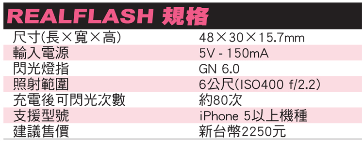 ![]() 既然是專門設計給iPhone使用,REALFLASH的外型設計上當然就融入了些許iPhone的元素,尤其是顏色的塗裝就與iPhone顏色相當,加上圓融的外觀造型,裝載在iPhone上時不會有太大的違和感,甚至還能當作手機的裝飾。不過這款閃光燈只有支援iPhone 5 以上的型號,購買前還是要先確認自己的iPhone是否支援。