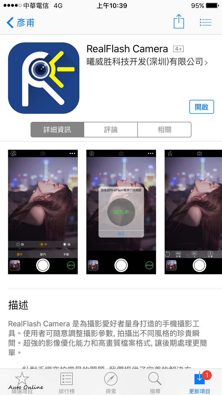 ![]() ▲感光窗位於閃光燈上方,開機後將感光窗對準手機LED閃燈後即可使用。REALFLASH的觸發方式來自於iPhone上的LED閃燈,因此裝機時要注意將感光器的位置對準手機的LED燈。 ![]() ▲原廠配置專用磁貼,建議黏貼位置在APPLE LOGO的下方。![]() ▲使用前須先至App Store 下載專用APP。![]() ▲RealFlash Camera APP操作介面相當簡單。