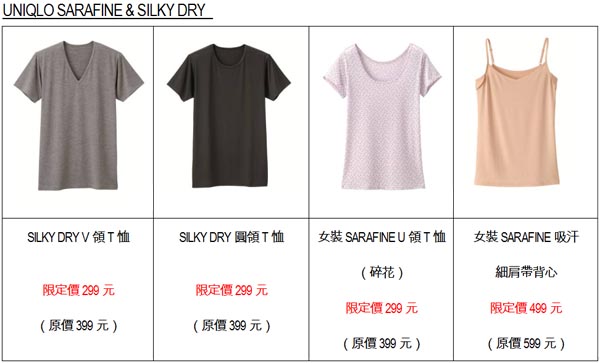 4/22~4/28 系列部分商品限定優惠UNIQLO將於4月22日起至4月28日止,推出SARAFINE、SILKY DRY系列限定價優惠。只要於活動期間至統一阪急百貨 台北店,無論是SARAFINE女裝或是SILKY DRY男裝,原價599元商品推出限定價499元,原價399元商品亦打出限定價299元,輕鬆體驗瞬間清新、夏日必備的機能性內衣。