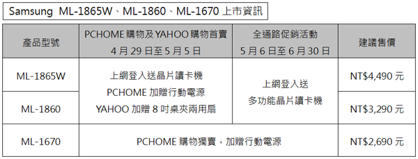 Samsung ML-1670純白優雅質感 列印工作輕鬆進行![]() ▲Samsung ML-1670針對精打細算的學生需求,Samsung ML-1670是經濟實惠的單功能黑白雷射印表機,將於4月29日起於PCHOME購物獨家販售,並加贈行動電源超值好禮。ML-1670內建智慧便利的隨觸印及Anyweb功能,列印速度更快速,每分鐘輸出16頁A4大小文件的速度,同時列印噪音少於49分貝,低噪音的列印動作讓工作不受干擾,更能提升工作表現。