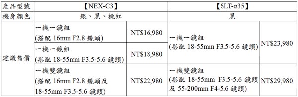 去年Sony的NEX系列無反光鏡單眼相機帶動新單眼攝影時尚,今年再推出【NEX-C3】口袋單眼,重量僅225公克,再次刷新世界最輕最小*註1數位單眼相機的記錄,採用APS-C感光元件,提供專業級的高畫質影像,並新增7大類、11種相片效果*註2,讓使用者輕鬆創造富有情感或特色的照片和影片,預期將成為年輕人最愛不釋手的隨身配備,其精巧的外型與色彩更將吸引女孩們也加入單眼攝影的新潮流。Sony同步推出入門單眼首選【SLT-α35】,採用半透明反光鏡、支援高速自動對焦與連拍,同樣新增全新的相片效果功能,只要簡單的操作,每個人都能成為攝影高手。